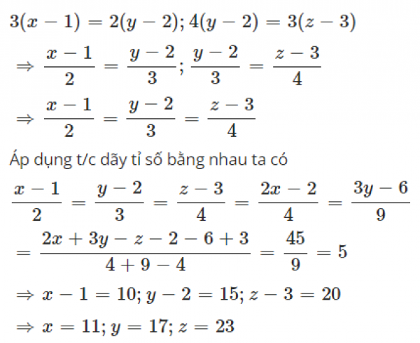 Tìm x, y, z biết: 3(x-1)= 2(y-2), 4(y-2)=3(z-3) và 2x+3y-z=50.