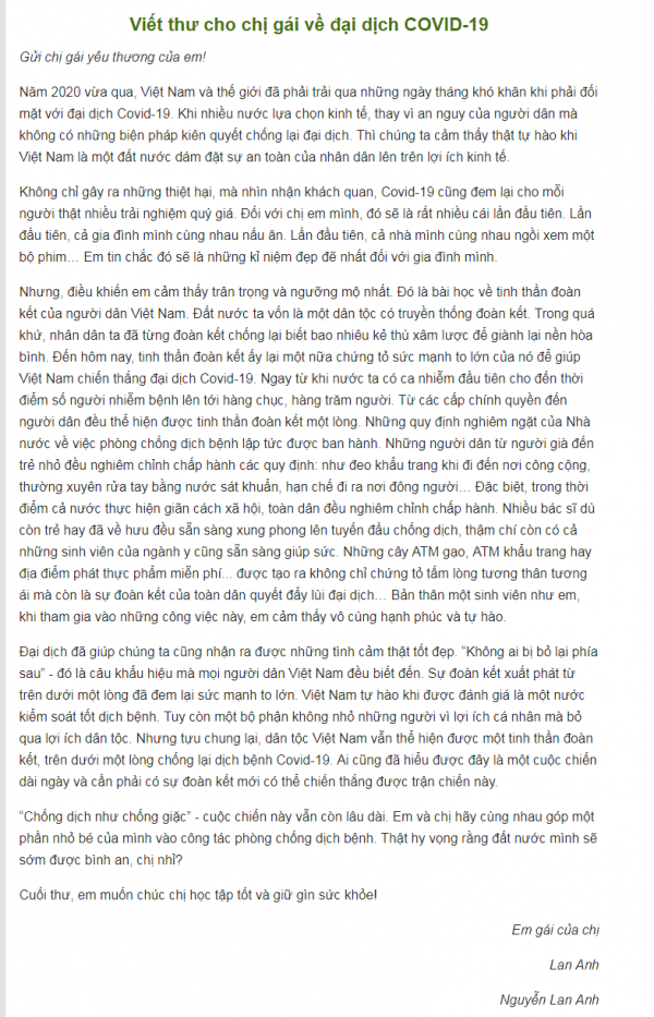 Thời điểm chị viết lá thư này là những ngày mà đất nước mình cùng với cả thế giới đang phải đối mặt với đại dịch Covid-19. Một đại dịch khủng khiếp đã cướp đi tính mạng của hàng nghìn người. Nhưng trong cơn đại dịch khủng khiếp này, chị đã học được rất nhiều bài học có ý nghĩa. Đại dịch không chỉ gây ra những thiệt hại về tính mạng con người và lợi ích kinh tế. Hãy thử nhìn theo chiều hướng tích cực, nó cũng để lại cho con người nhiều bài học nhận thức.