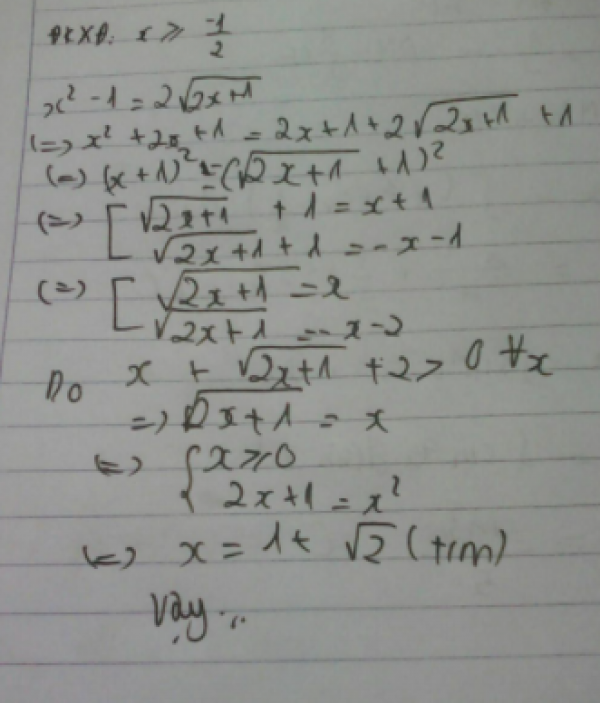 x^2 + 1 = 2căn(2x - 1) (ĐK: x > hoặc = 1/2) <=> x^2 + 1 - 2 căn(2X - 1) = 0 <=> x^2 + 1 + (2x - 1 + 2căn(2x - 1) + 1) - 2x = 0 <=> (x^2 - 2x + 1) + (căn(2x - 1) - 1)^2 = 0 <=> (x - 1)^2 + (căn(2x - 1) - 1)^2 = 0 <=> x - 1 = 0 và căn(2x - 1) - 1 = 0 <=> x = 1 (thỏa mãn) Vậy x = 1