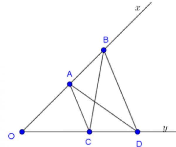 Cho góc xOy, trên Ox lấy A và B, trên Oy lấy C và D sao cho OA=OC, AB=CD.