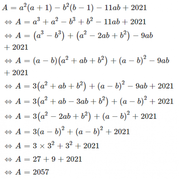 Cho a - b = 3. Tính A = (a+1) - (b - 1) - 11ab + 2021