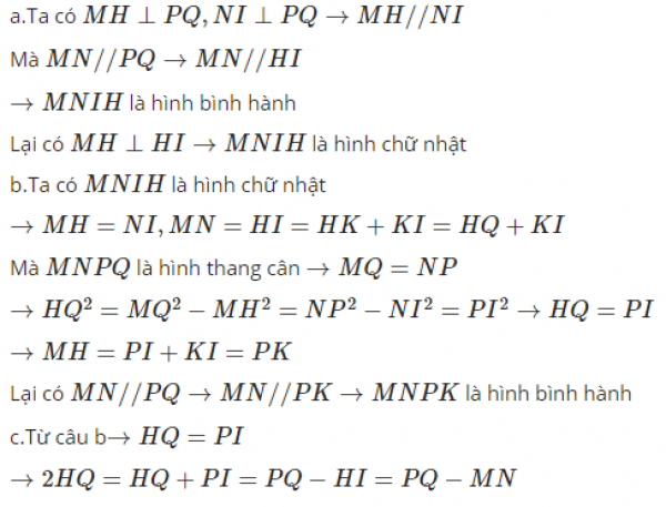 Cho hình thang cân MNPQ (MN//PQ). Kẻ MH vuông góc với QP, NI vuông góc với QP