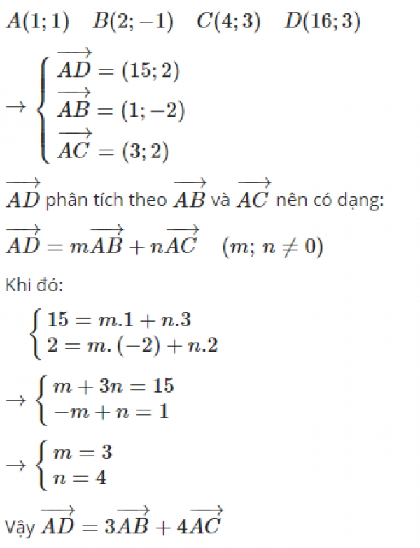 Trong hệ trục tọa độ Oxy cho bốn điểm A(1;1), B(2;-1), C(4;3), D(16;3). Hãy phân tích theo và .