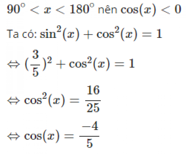 Cho sin(x) = 35; 90°<x<180°. Tính cos X