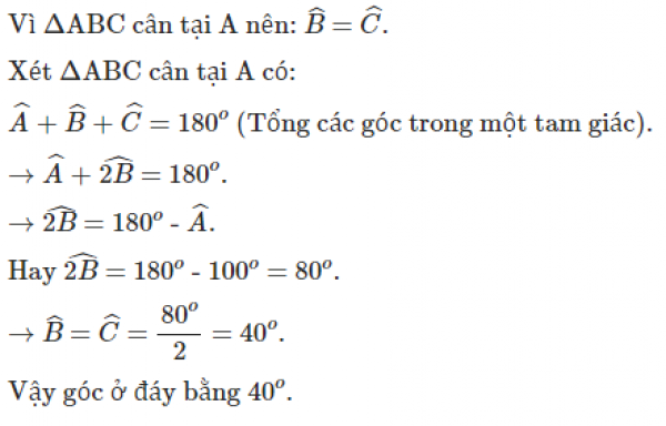 Một tam giác cân có góc ở đỉnh bằng 100 độ thì góc ở đáy bằng bao nhiêu?