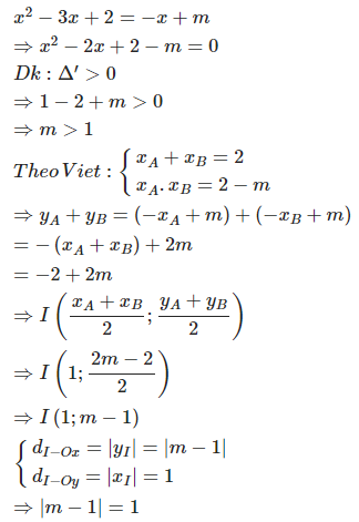 Cho hàm số y = và hàm số y=-x+m. Tìm M để đồ thị các hàm số đó cắt nhau tại 2 điiểm phân biệt A,B đồng thời khoảng cách từ trung điểm I của đoạn AB đến các trục tọa độ bằng nhau.
