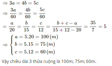 Ba thửa ruộng hình chữ nhật ABC có cùng diện tích. Chiều rộng của ba thửa ruộng a,b,c lần lượt tỉ lệ với 3, 4, 5. Chiều dài của thửa ruộng a nhỏ hơn tổng chiều dài của hai thửa ruộng b và c là 35m. Tính chiều dài mỗi thửa ruộng.