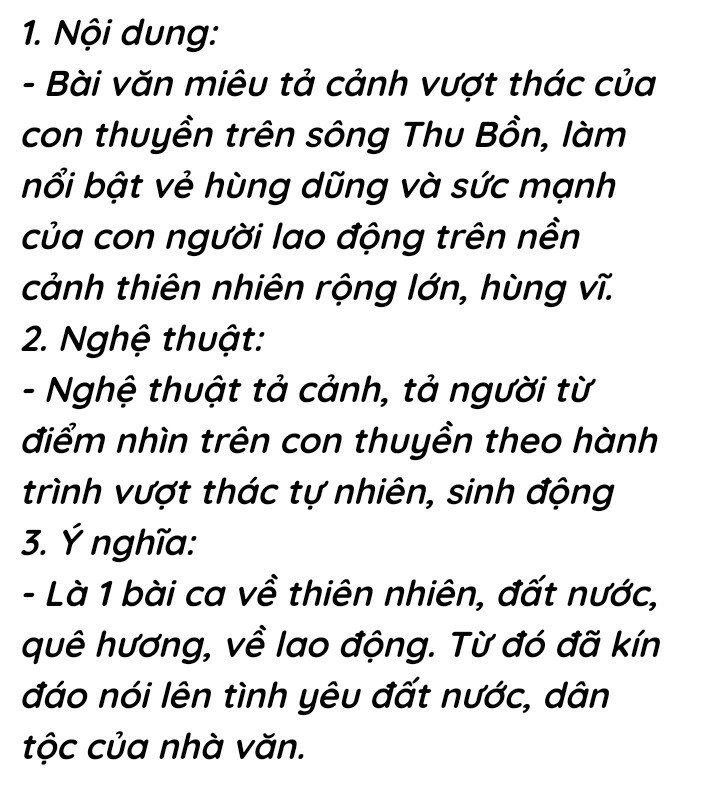 + Nội dung: Bài văn miêu tả cảnh vượt thác của con thuyền trên sông Thu Bồn, làm nổi bật vẻ hùng dũng và sức mạnh của con người lao động trên nền cảnh thiên nhiên rộng lớn, hùng vĩ
