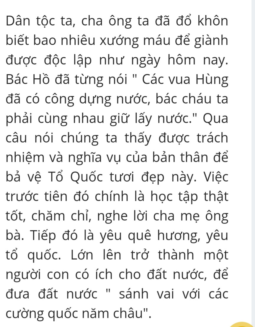 Dân tộc ta, cha ông ta đã đổ khôn biết bao nhiêu xướng máu để giành được độc lập như ngày hôm nay. Bác Hồ đã từng nói " Các vua Hùng đã có công dựng nước, bác cháu ta phải cùng nhau giữ lấy nước." Qua câu nói chúng ta thấy được trách nhiệm và nghĩa vụ của bản thân để bả vệ Tổ Quốc tươi đẹp này. Việc trước tiên đó chính là học tập thật tốt, chăm chỉ, nghe lời cha mẹ ông bà. Tiếp đó là yêu quê hương, yêu tổ quốc. Lớn lên trở thành một người con có ích cho đất nước, để đưa đất nước " sánh vai với các cường quốc năm châu".