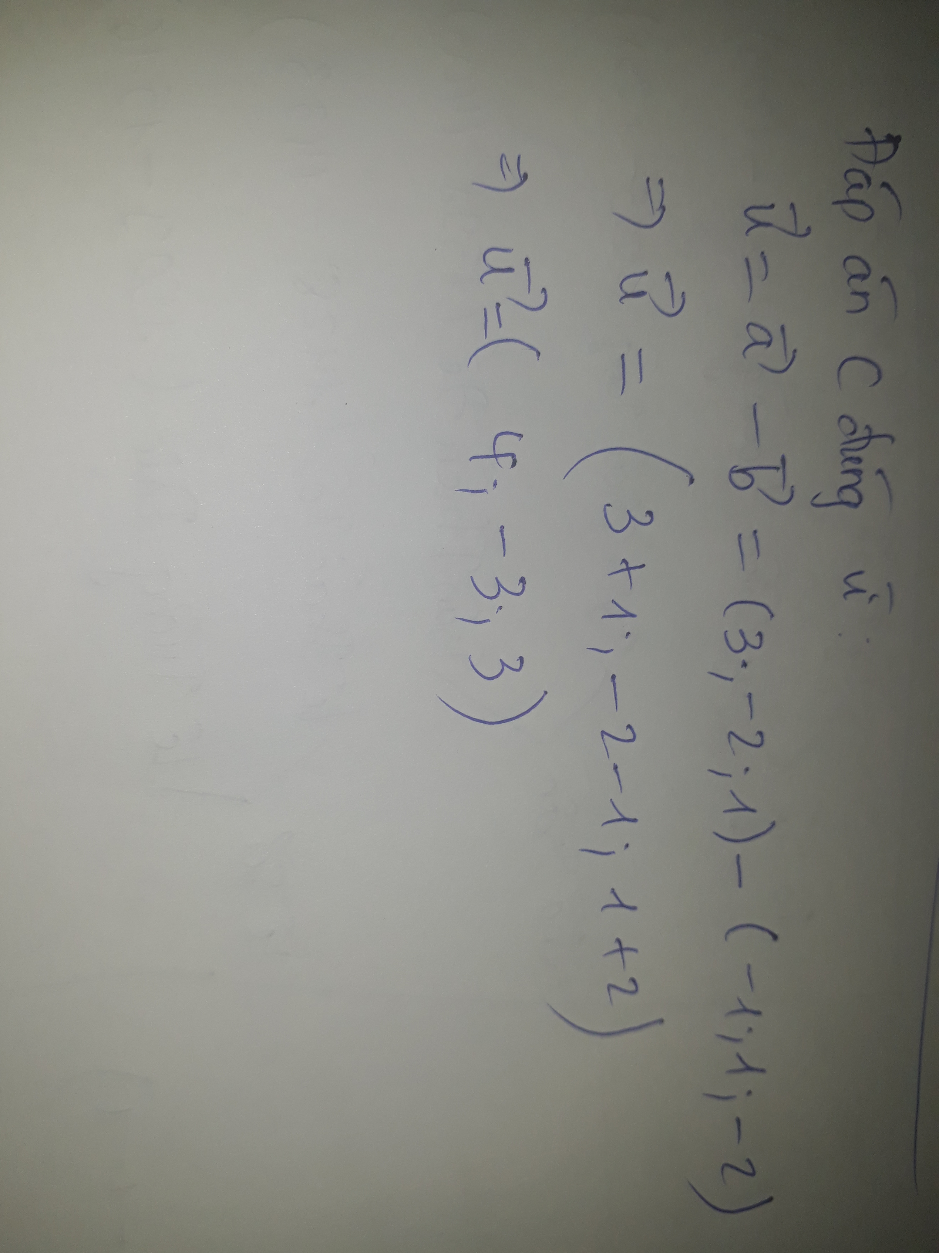 câu 2: trong không gian với hệ tọa độ oxyz, cho các vecto =a(3;-2;1), b=(-1;1;-2) u=(4;-3;3). mệnh đề nào sau đây đúng?