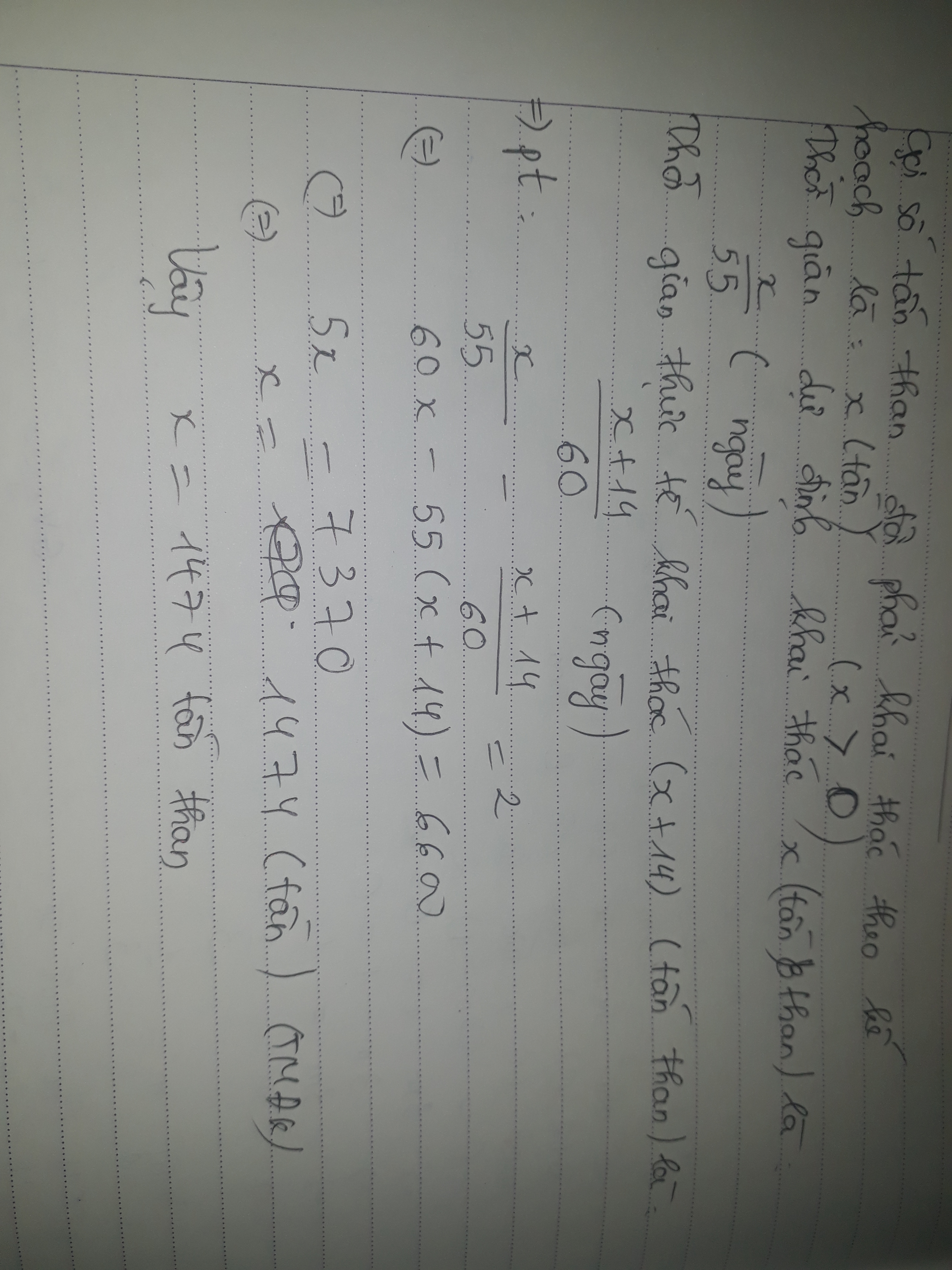 Một đội thợ mỏ lập kế hoạch khai thác than theo đó mỗi ngày phải khai thác được 55 tấn than khi thực hiện mỗi ngày đội khai thác được 60 tấn than do đó đội đã hoàn thành kế hoạch trước 2 ngày và còn vượt mức 14 tấn than.Hỏi theo kế hoạch đội phải khai thác bao nhiêu tấn than