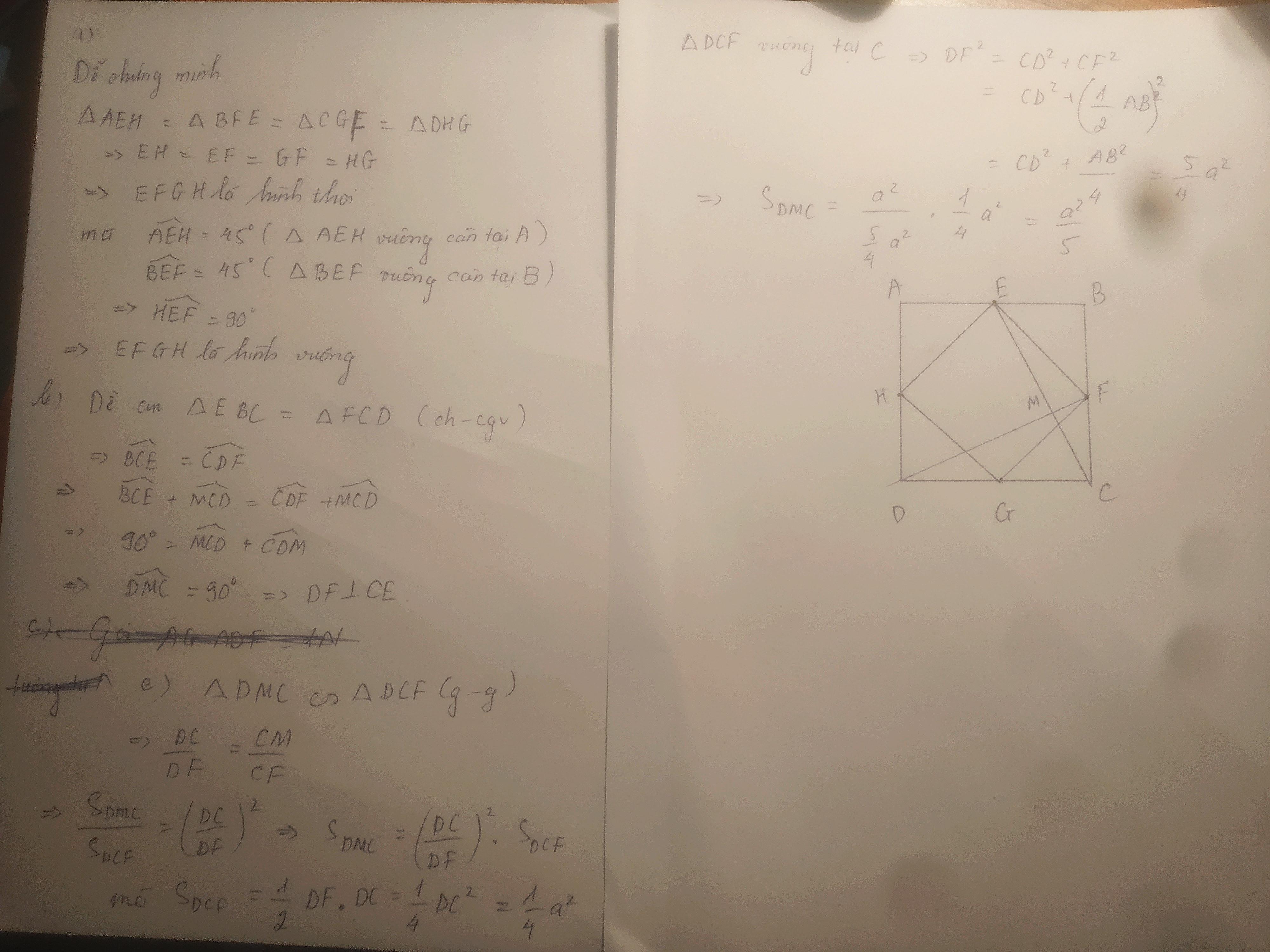 cho hình vuông ABCD có các cạnh bằng a. Gọi E,F,G,H lần lượt là trung điểm của các cạnh AB,BC,CD,DA. M là giao điểm của CE và DF. a,chứng minh: Tứ giác EFGH là hình vuông b, chứng minh: DF vuông góc với CE c,tam giác MAD cân d,tính diện tích tam giác MDC theo a