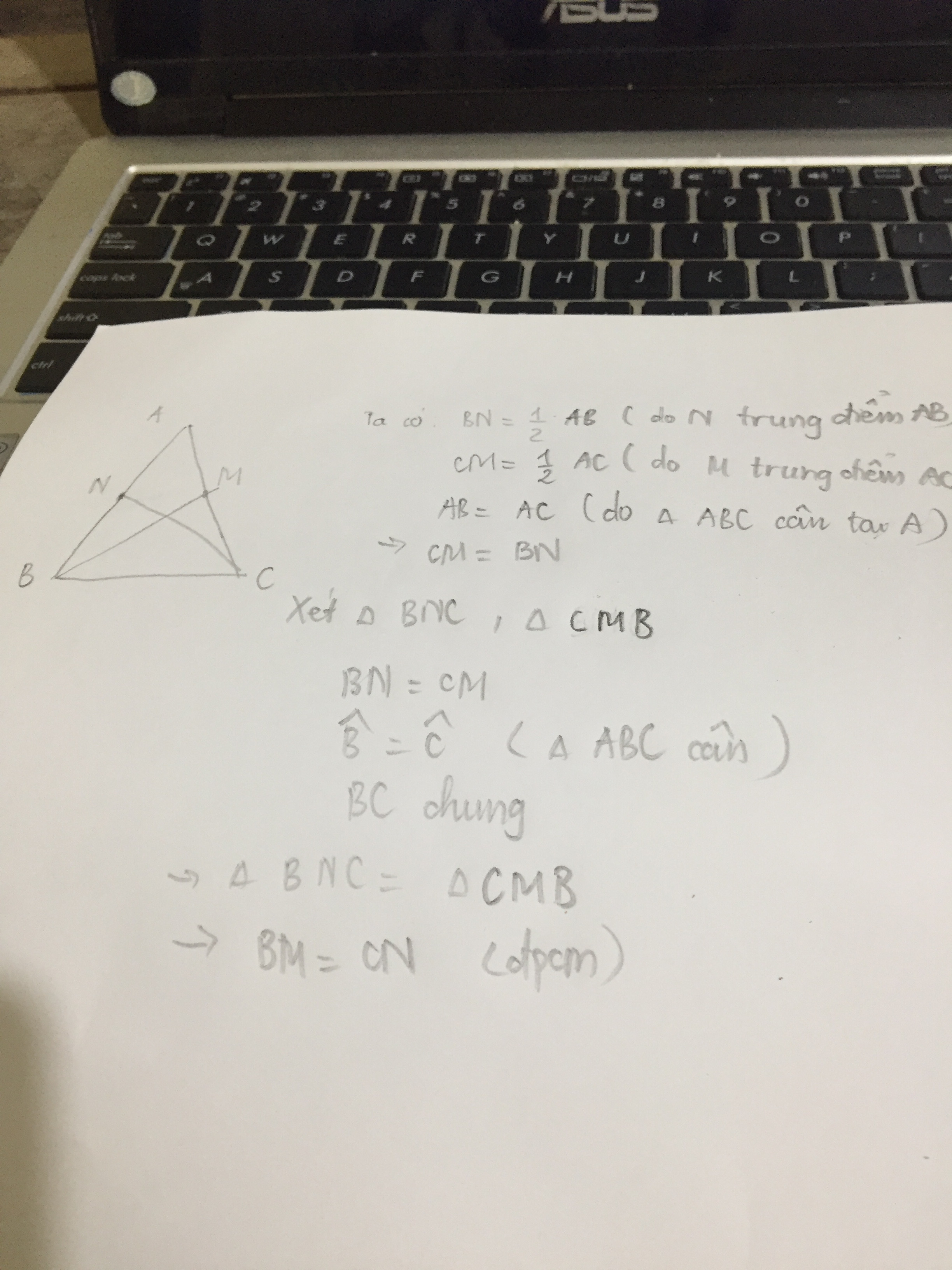 Cho tam giác ABC cân tại A gọi M là trung điểm của AC,N là trung điểm của AB. Chứng minh rằng BM=CN
