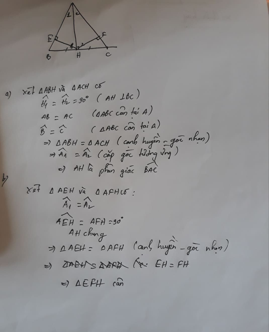 b.từ H vẽ HE vuông góc AB tại E HF vuông góc ACtại F chứng minh tam giác EAH =tam giác FAH rồi suy ra tam giác HEF là tam giác cân