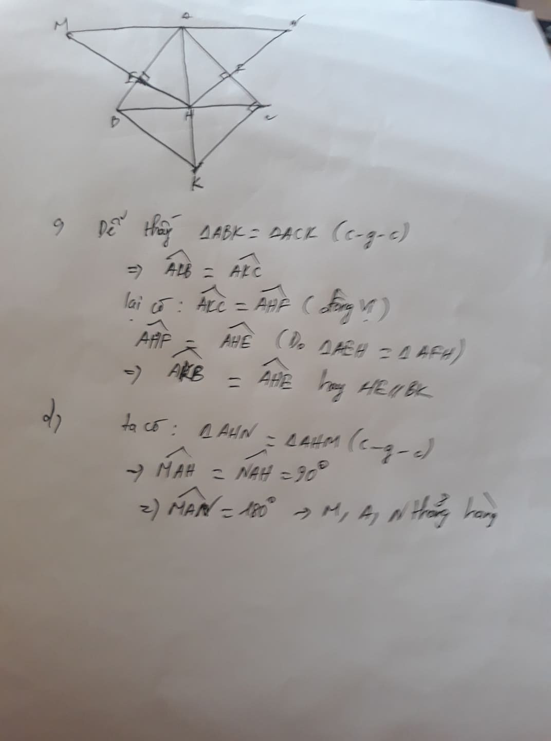 d qua A vẽ đường thẳng song song với BC cắt tia HF tại N trên tia HE lấy điểm M sao cho HM=HN :chứng minh M,A,N thẳng hàng