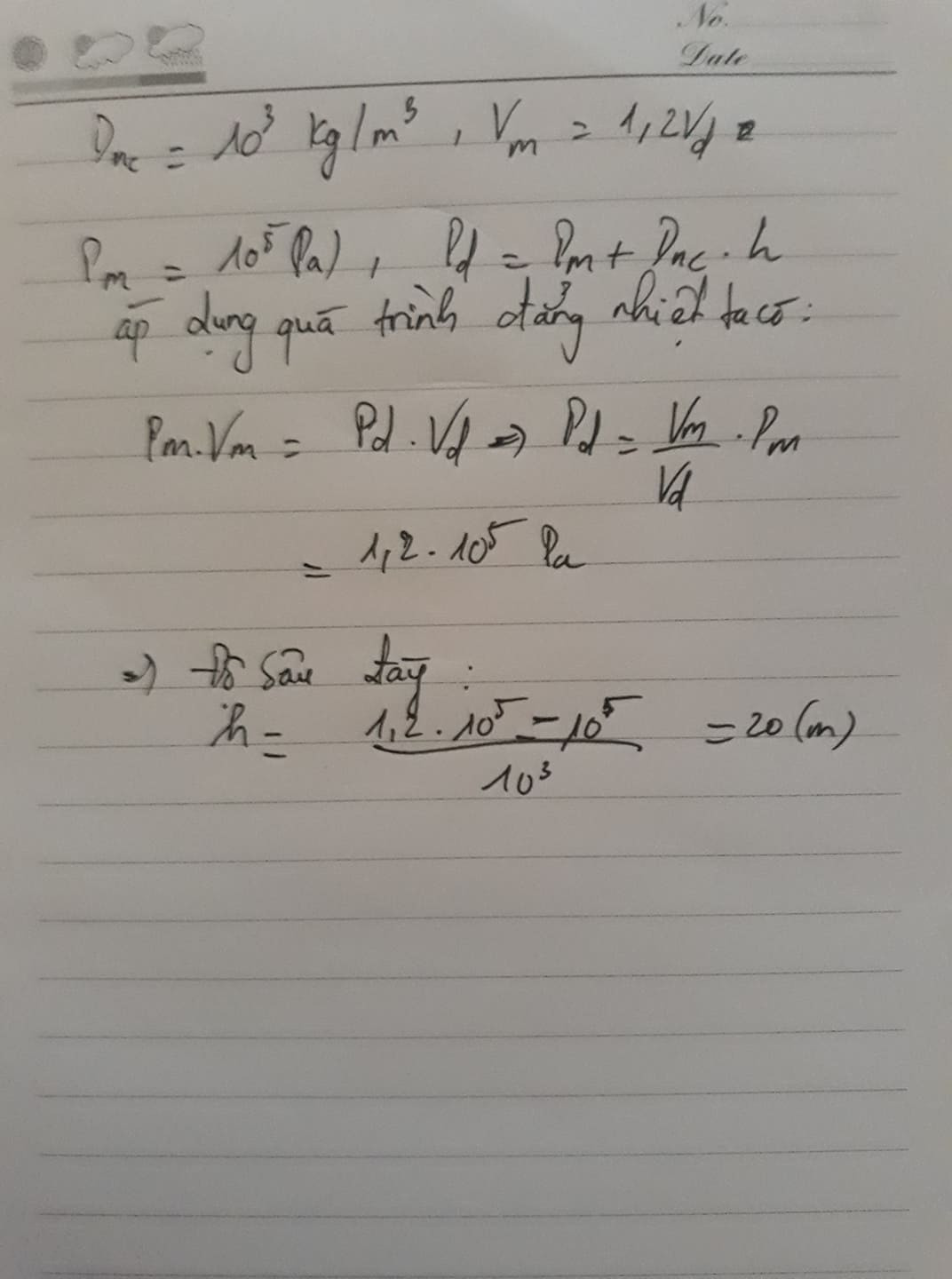 Tính độ sâu của đáy hồ nơi có bong bóng khí nổi lên từ đáy. Biết khối lượng riêng của nước là 10^3 kg/m3, thể tích của bong bóng tại mặt hồ tăng 1,2 lần và áp suất tại mặt hồ là 10^5 Pa.
