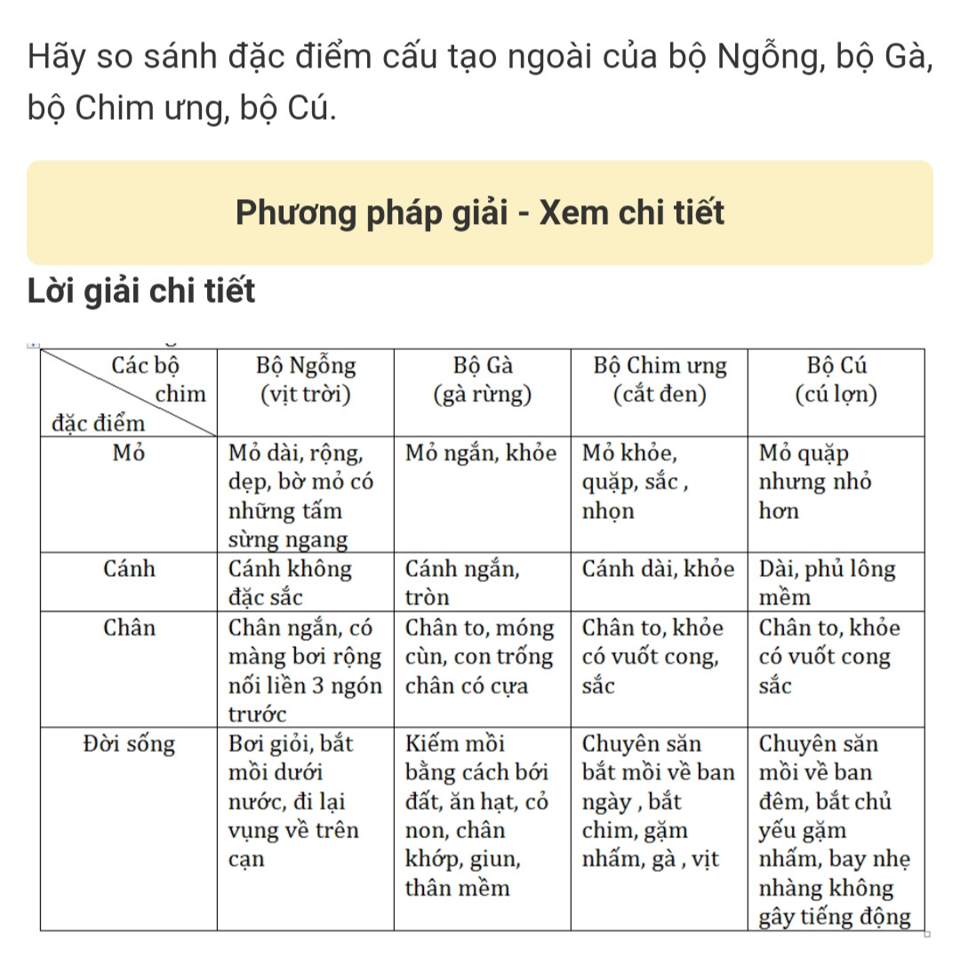 hãy so sánh đặc điểm cấu tạo ngoài của bộ ngỗng bộ gà bộ chim ưng, bộ cú