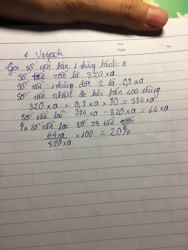 Một cửa hàng bán bánh kẹo nhập 400 thùng bánh. Đợt 1 bán được 320 thùng, cửa hàng đã thu đủ số tiền vốn. Số bánh còn lại cửa hàng đã giảm giá bán 20% so với giá bán của 320 thùng đợt 1. Hỏi sau khi bán hết 400 thùng bánh đó cửa hàng được lãi bao nhiêu % tiền vốn