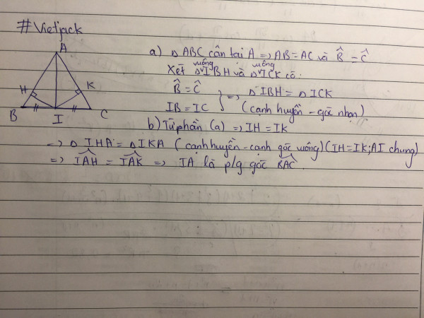 Bài 2: Cho ∆ABC cân tại A. Gọi I là trung điểm của BC. Từ I vẽ IH ^ AB tại H; IK ^ AC tại K.