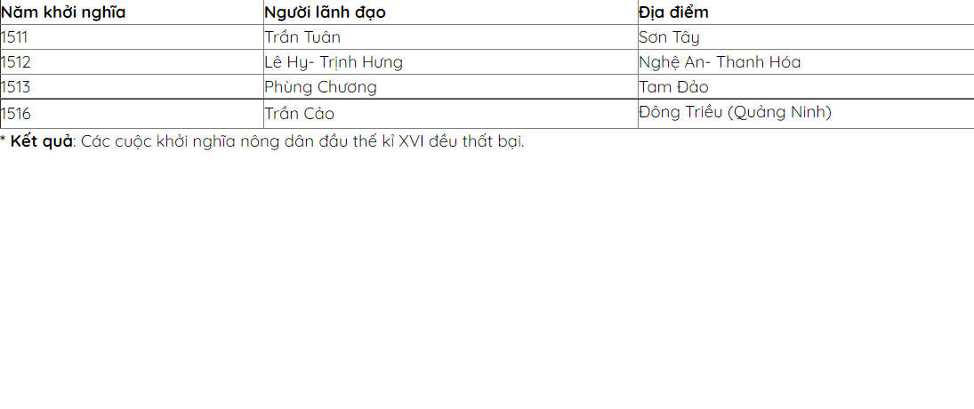 Lập bảng thống kê các cuộc khởi nghĩa nông dân tiêu biểu ở thế kỷ 16 theo các nội dung: thời gian số lượng B phạm vi hoạt động C Lực lượng tham gia D kết quả