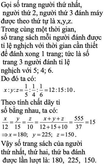 Một bản thảo cuốn sách dày 555 trang được giao cho 3 người đánh máy. Để đánh máy một trang người thứ nhất cần 5 phút, người thứ 2 cần 4 phút, người thứ 3 cần 6 phút. Hỏi mỗi người đánh máy được bao nhiêu trang bản thảo, biết rằng cả 3 người cùng nhau làm từ đầu đến khi đánh máy xong.