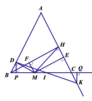 Cho tam giác ABC cân tại A, BH vuông góc AC tại H. Trên cạnh BC lấy điểm M bất kì (M khác B và C). Gọi D, E, F là chân đường vuông góc hạ từ M đến AB, AC, BH.