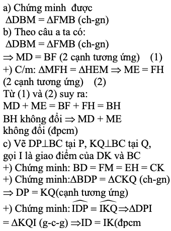 b) Chứng minh khi M chạy trên cạnh BC thì tổng MD + ME có giá trị không đổi.