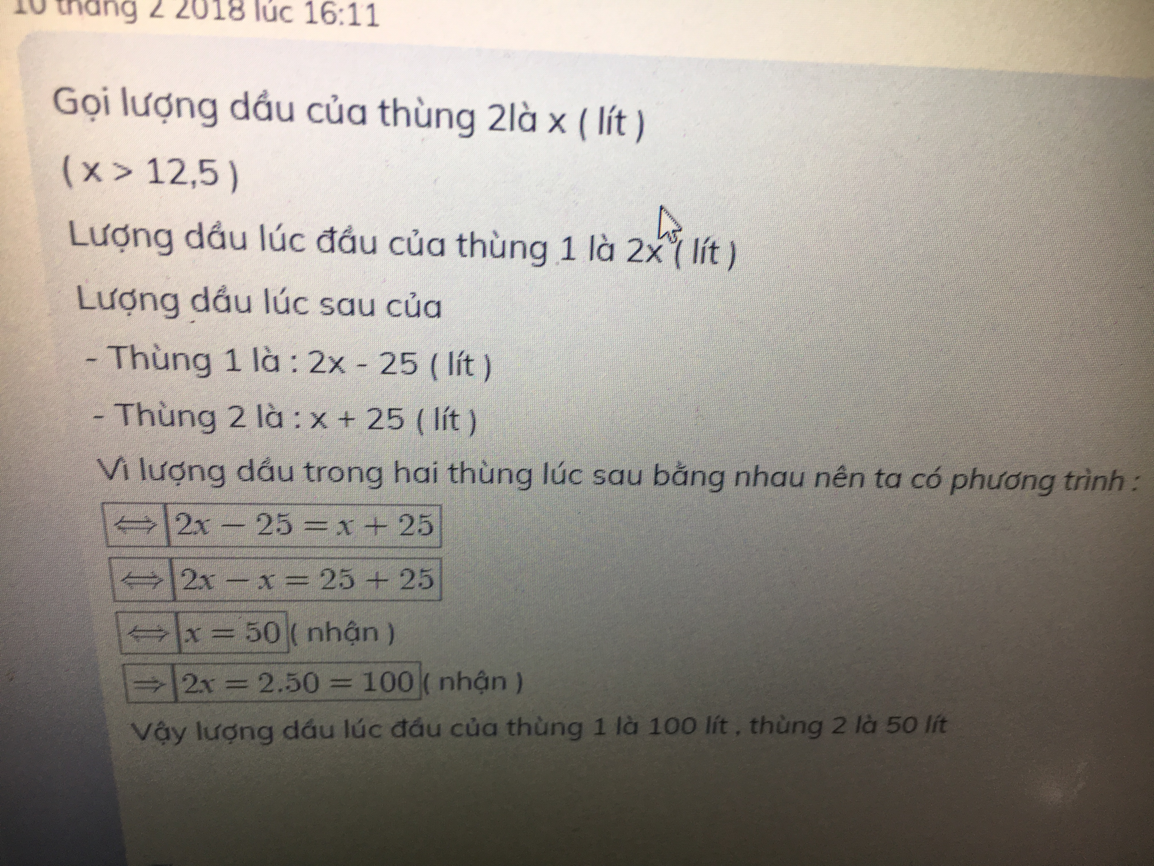 Thùng dầu thứ nhất chứa nhiều gấp đôi thùng dầu thứ hai. Nếu chuyển từ thùng thứ nhất sang thùng dầu thứ hai 25 lít thì lượng dầu hai thùng bằng nhau. Tính lượng dầu trong mỗi thùng lúc đầu.