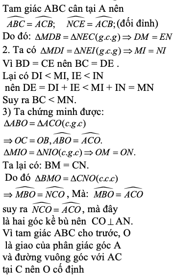 Cho tam giác ABC cân tại A. Trên cạnh BC lấy điểm D (D khác B, C). Trên tia đối của tia CB, lấy điểm E sao cho CE = BD. Đường vuông góc với BC kẻ từ D cắt AB tại M. Đường vuông góc với BC kẻ từ E cắt đường thẳng AC tại N, MN cắt BC tại I.