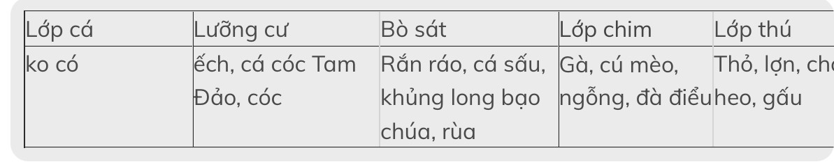 Có các loài sau:cá quả ,cá cóc tam đảo,cá đuối,cá rô phi,cá chuồn,khủng long cá,cá bơn,cá chép.Xắp sếp các loài đó vào các lớp động vật đã học