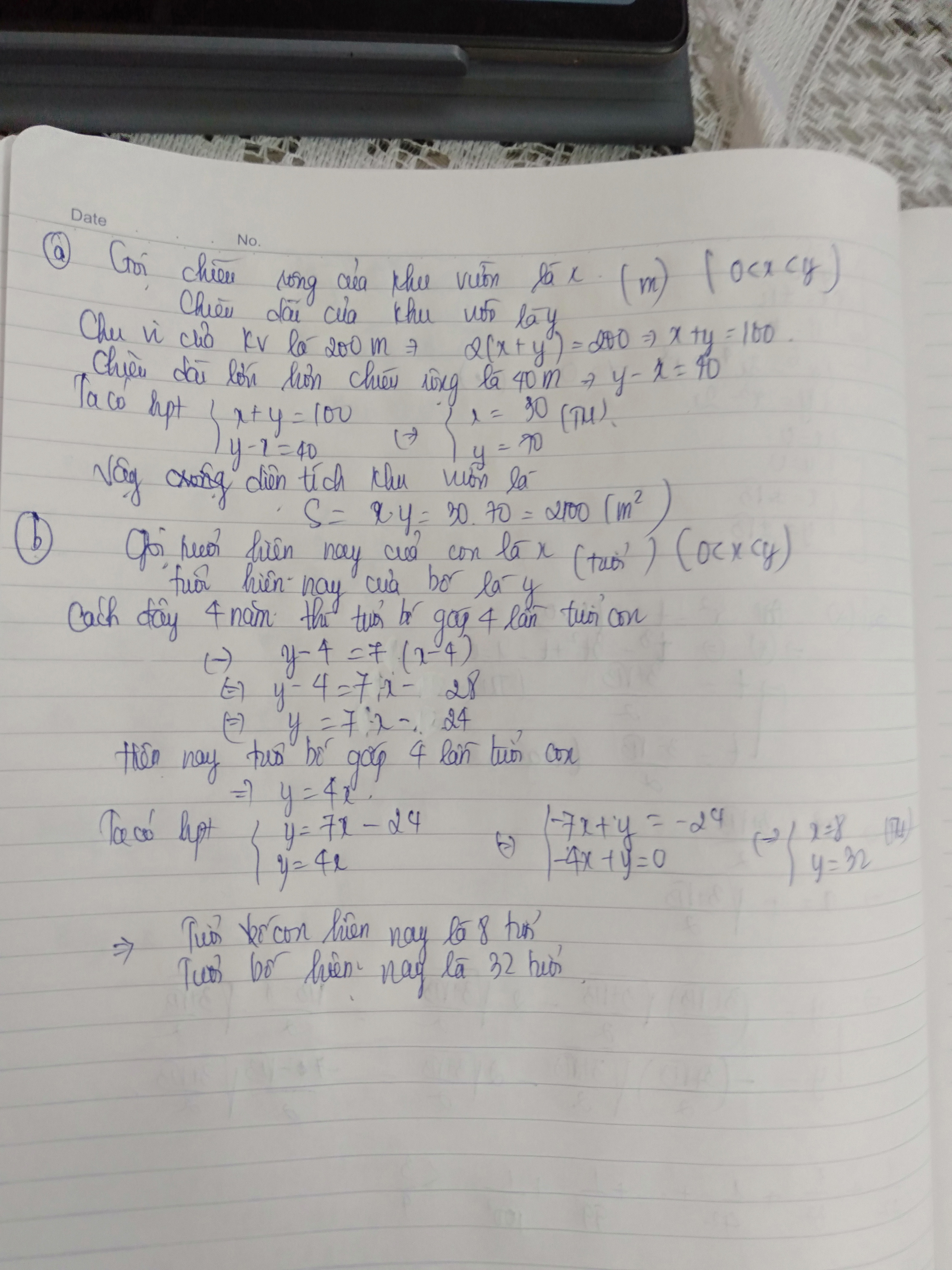 a) Chu vi của 1 khu vườn là 200m, biết chiều dai hơn chiều rộng là 40m. Tính diện tích của khu vườn