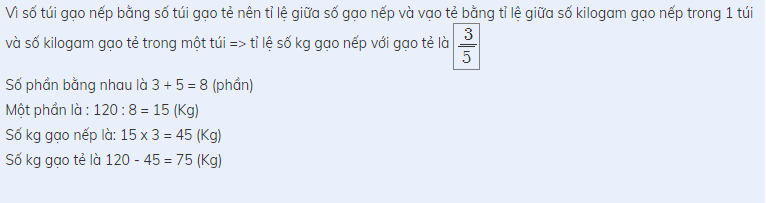 1 người có 120 kg gạo nếp và tẻ người đó đổ gạo nếp vào các túi ,mỗi túi 3 kg và đổ gạo tẻ vào các túi , mỗi túi 5kg . Hỏi người đó có bnh kg gạo mỗi loại