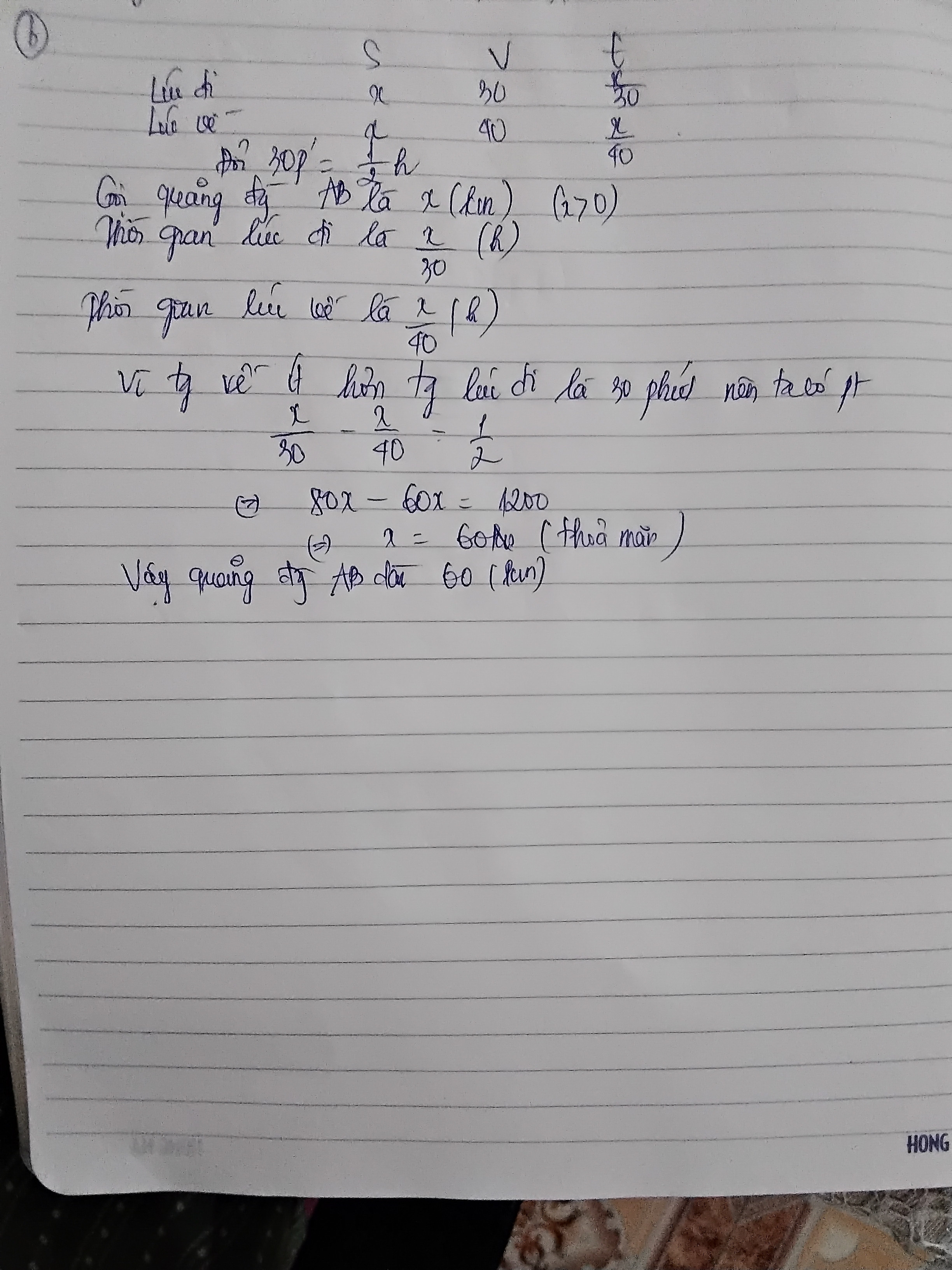 b) 1 người đi xe máy từ A đến B với vận tốc 30km/h. Lúc về người đó đi với vận tốc 40km/h nên thời gian về ít hơn thời gian đi 30 phút. Tính quãng đường AB
