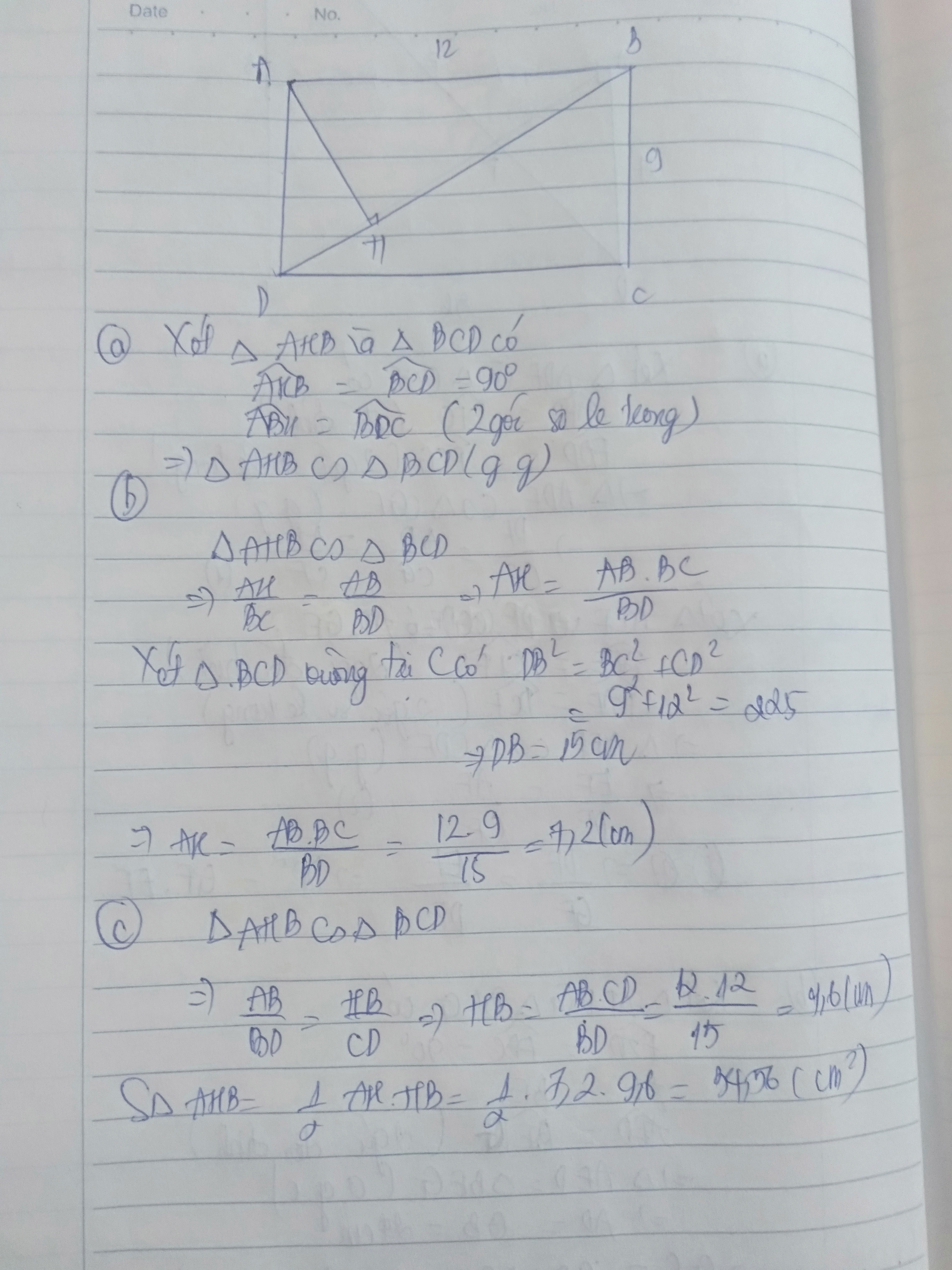 2 ) Cho hình chữ nhật ABCD có AB = 12cm , BC = 9cm.Gọi H là chân đường vuông góc kẻ từ A xuống BD . a ) Chứng minh tam giác AHB đồng dạng tam giác BCD . b ) Tính độ dài AH . c ) Tính diện tích tam giác AHB .