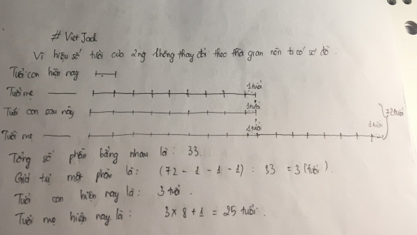 Hiện nay mẹ hơn 8 lần tuổi con là 1 tuổi. Đến khi tuổi con bằng tuổi mẹ hiện nay thì tổng số tuổi của hai mẹ con là 72 tuổi. Tính tuổi mẹ hiện nay.