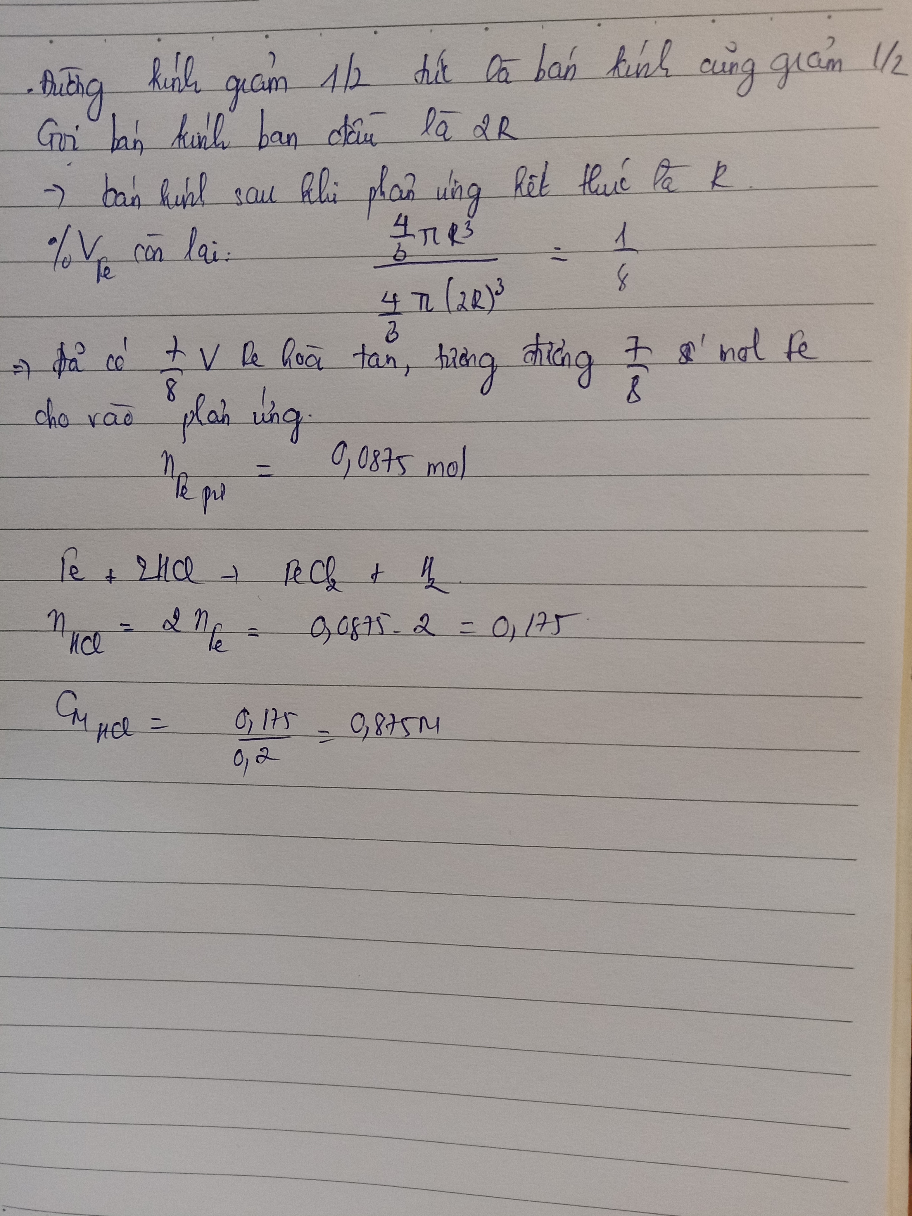 Thả một viên bi sắt nguyên chất hình cầu nặng 5,6 gam vào 200 ml dung dịch HCl .Khi khí ngừng thoát ra thì đường kính viên bi còn lại bằng 1/2 đường kính ban đầu (giả sử viên bi bị ăn mòn đều về mọi phía). Xác định nồng độ mol của dd HCl.