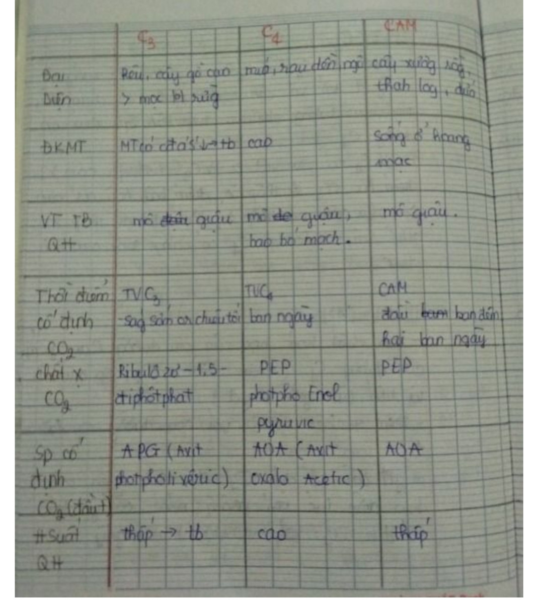 So sánh quá trình quang hợp của 3 nhóm thực vật C3 ,C4 và Cam ?