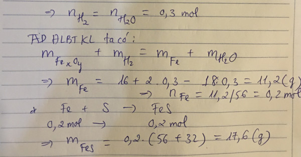Dùng 6.72 lít H2 đktc đủ khử hoàn toàn 16g FexOy. Lượng Fe thu được đủ tác dụng bao nhiêu g S. Tìm số g FeS tạo thành.