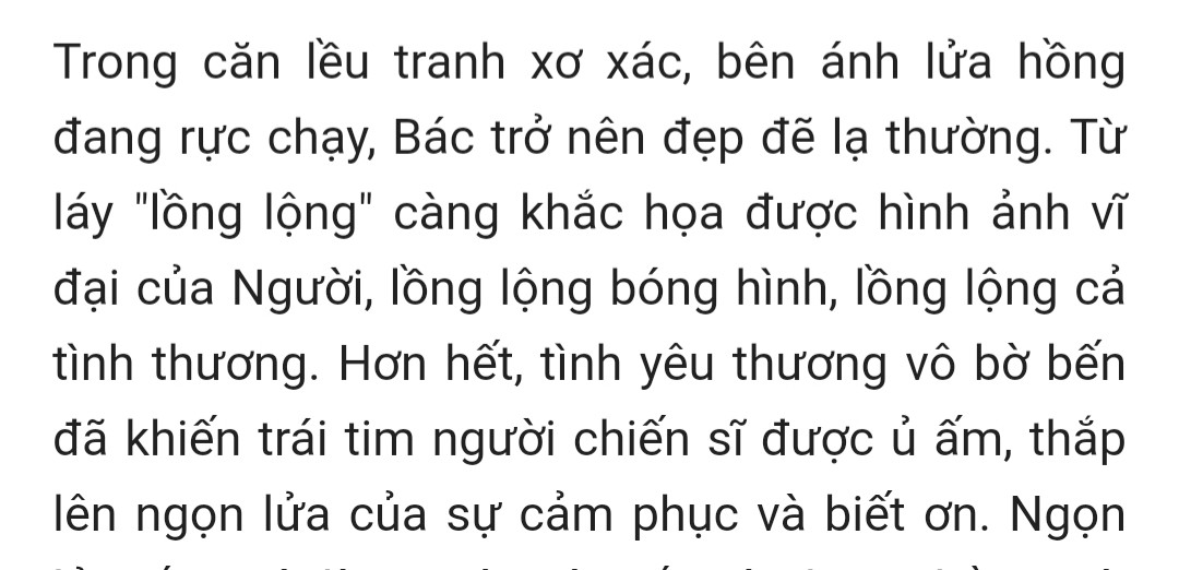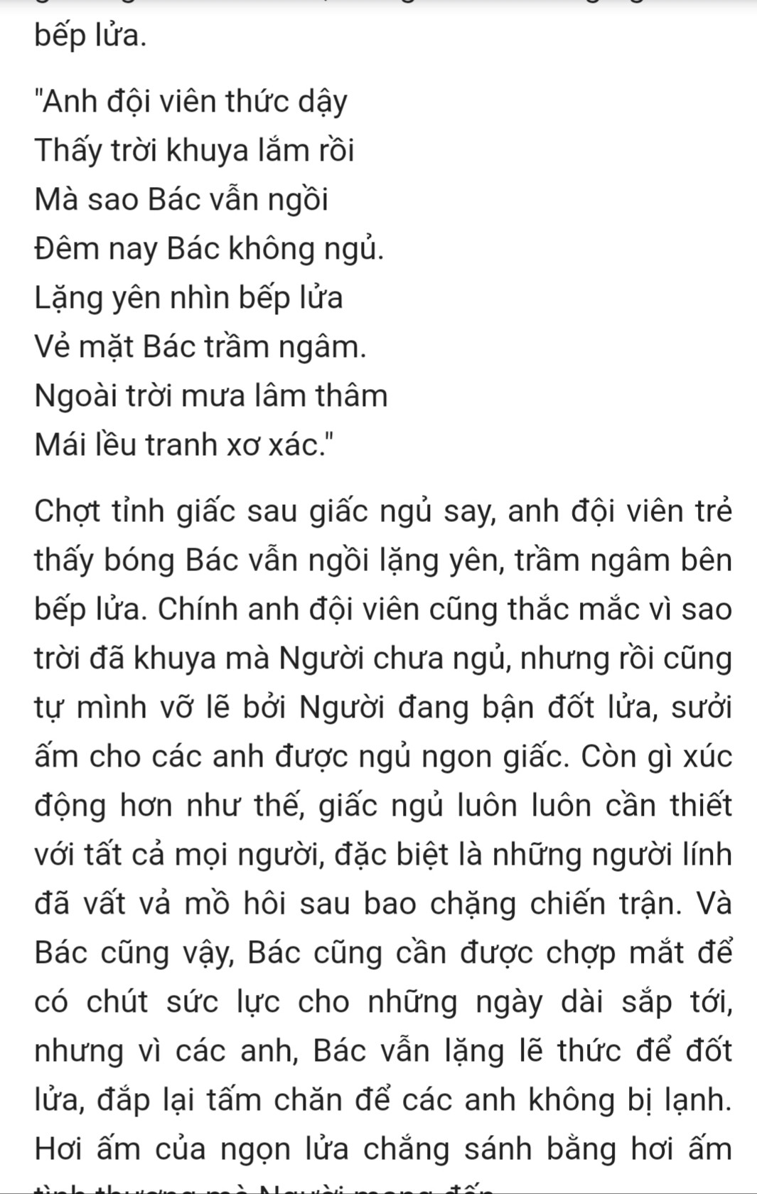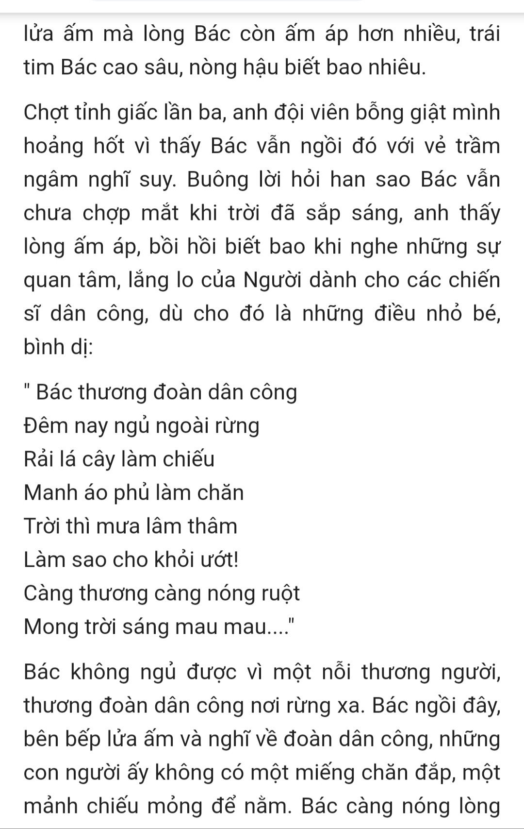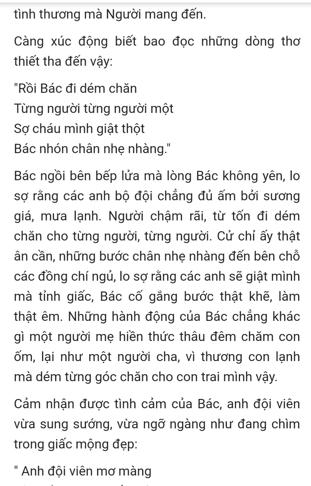 truyền thêm niềm tin sức mạnh để đi tới ngày mai. Người chiến sĩ cảm thấy Bác thật vĩ đại, tình yêu thương của Bác thật bao la, sâu thẳm, Bác lo cho mọi người hơn lo cho cả chính mình. Hình ảnh “trầm ngâm”, “đinh ninh”, “im phăng phắc” đã làm tôn thêm tính chất thâm trầm, vững chãi của Bác, ta có thể hình dung Bác như bức tường thành cứng cáp bảo vệ cho chiến sĩ đang ở ngoài mặt trận. Bác là một vị lãnh tụ của đất nước với bao nỗi lo toan, lại là tuổi đã cao nhưng Bác vẫn tham gia chiến dịch. Đáng lẽ Bác phải ngủ sớm để còn lo cho công việc ngày mai. Vậy mà Bác không ngủ, thức suốt đêm để chăm sóc, lo lắng cho người khác.