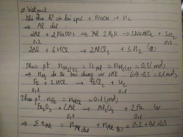 Đốt nóng 1 hh X gồm bột Fe2O3 và bột Al trong môi trường không có không khí. Những chất rắn còn lại sau phản ứng,nếu cho tác dụng với dd NaOH dư sẽ thu được 0,3 mol H2. Nếu cho tác dụng với dung dịch HCl dư sẽ thu được 0,4mol H2. Hỏi số mol Al trong X là bao nhiêu