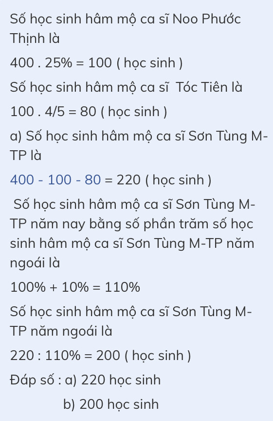 b, Ban tổ chức nhận xét: Số học sinh hâm mộ ca sĩ Sơn Tùng M-TP năm nay tăng 10% so với năm ngoái. Hỏi năm ngoái ca sĩ Sơn Tùng M-TP được bao nhiêu học sinh trong câu lạc bộ hâm mộ.