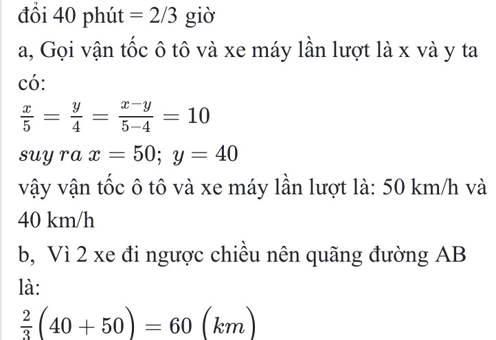 Một ô tô đi từ A đến B, cùng lúc đó một xe máy đi từ B đến A . Sau 40 phút hai xe gặp nhau. Vận tốc của ô tô và xe máy tỉ lệ với 5 và 4. Biết vận tốc ô tô lớn hơn vận tốc xe máy 10km/h.