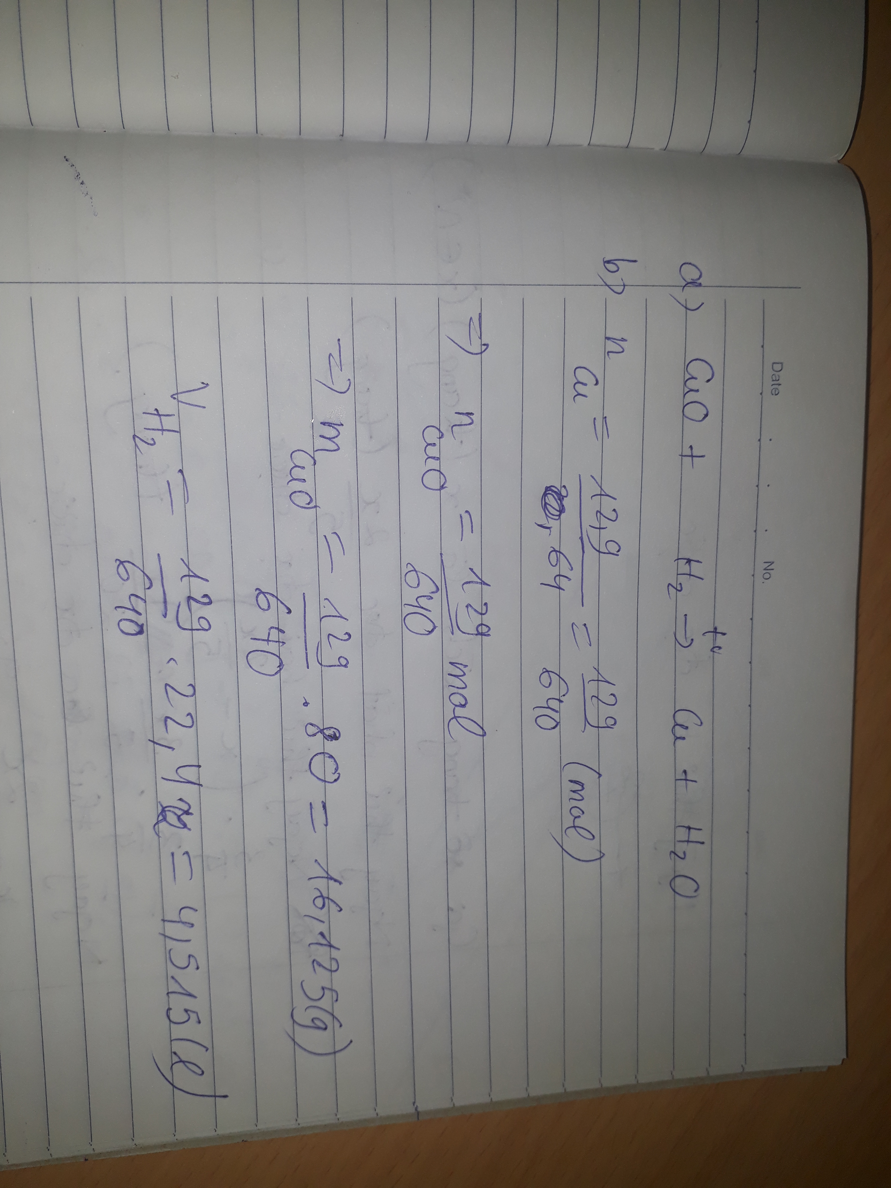 b) sau phản ứng thu được 12,9g Cu hảy tính khối lượng CuO tham gia phản ứng và thể tích H2 (đktc) cần dùng
