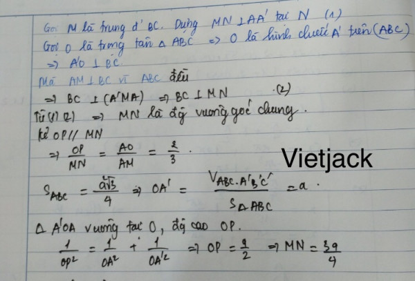Cho lăng trụ ABC.A′B′C′ có đáy là tam giác đều cạnh a. Hình chiếu vuông góc của điểm A′ lên mặt phẳng (ABC) trùng với trọng tâm tam giác ABC. Biết thể tích của khối lăng trụ là a33 /4. Tính khoảng cách giữa hai đường thẳng AA′ và BC.
