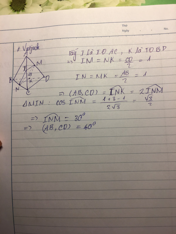 Cho tứ diện ABCD. Gọi M,N lần lượt là trung điểm của các cạnh AD, BC; AB=CD=2,MN=√3. Góc giữa hai đường thẳng AB và CD bằng