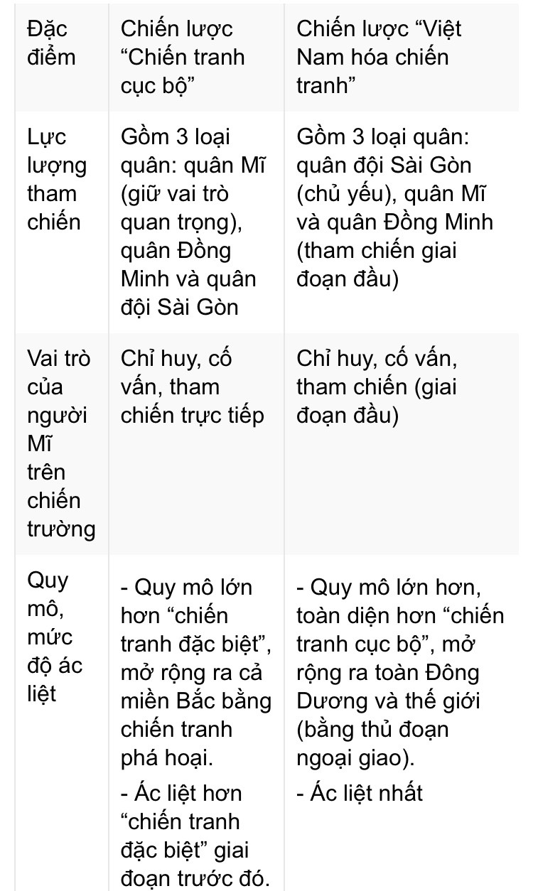 So sánh điểm giống nhau và khác nhau của Chiến lược ' Chiến tranh cực bộ ' (1965-1968) và chiến lược ' VN hóa chiến tranh (1969-1973) của mĩ ở miền Nam VN.