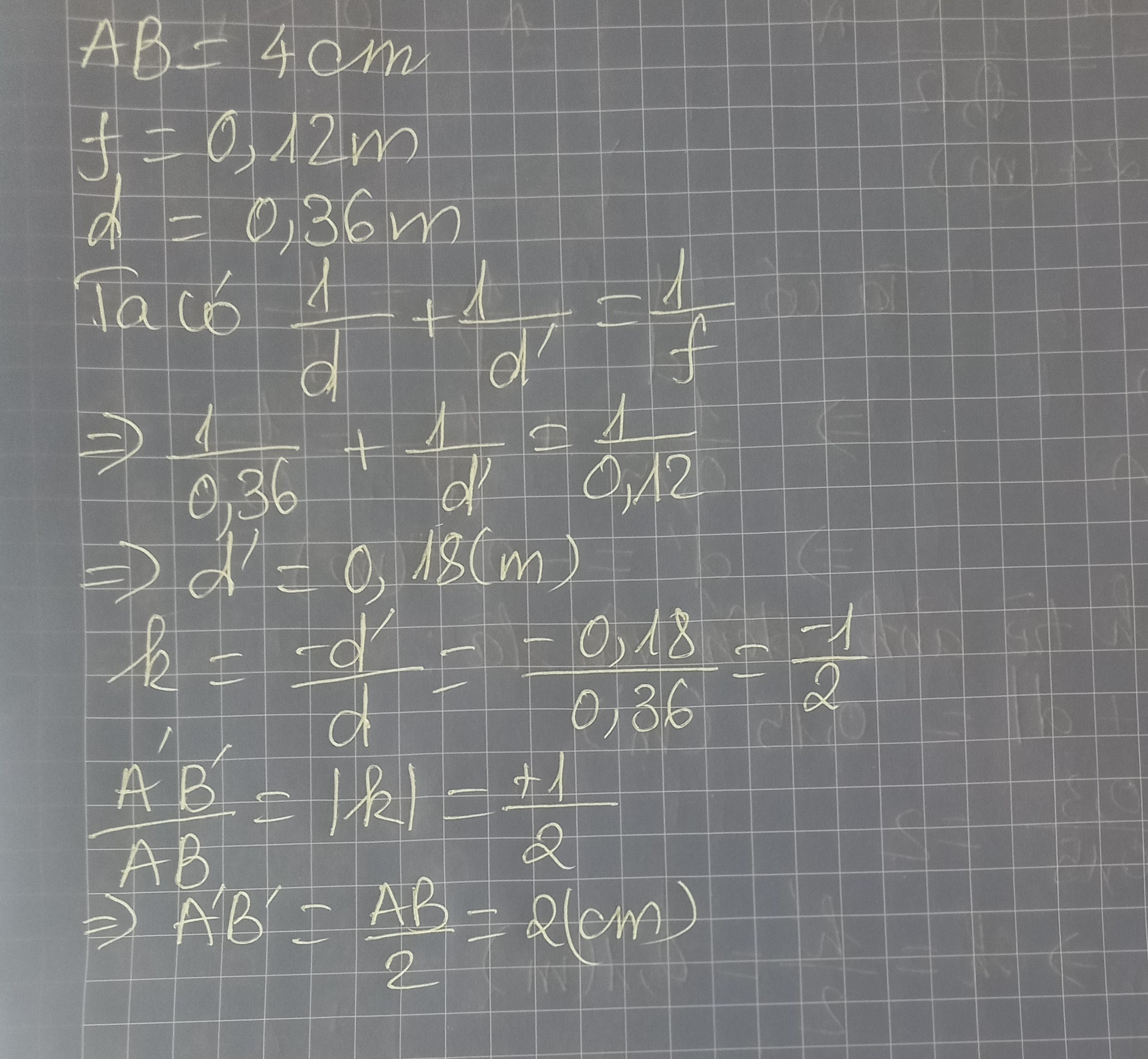 Một vật AB= 4cm có dạng mũi tên , được đặc vuông góc với trục chính của một thấu kính hội tụco tiêu cự 12cm ,A nằm trên trục chính và cách thấu kính 36cm