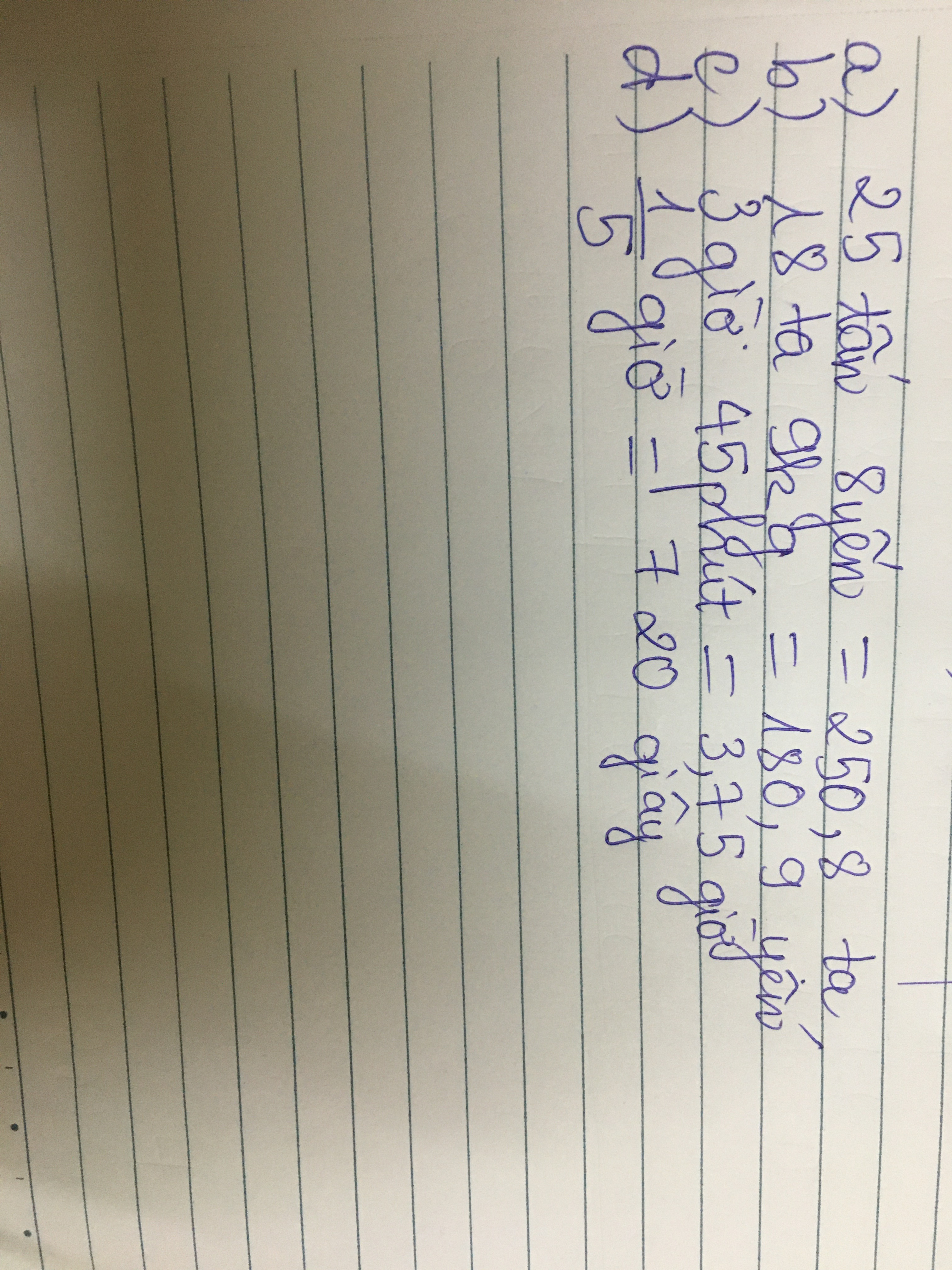 A) 25 tấn 8 yến =tạ B)18 tạ 9 kg=yến C) 3 giờ 45 phút =giờ D) 1/5 giờ =giây