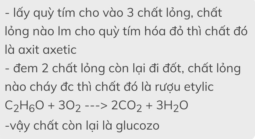có 3 lị mất nhãn sau : rượu etylic ,axit axitc, dung dịnh glucozơ nêu cách phân biệt các dung dịnh trên . viết PTHH