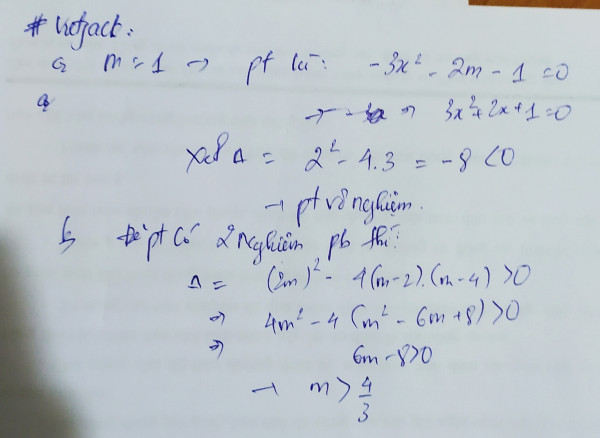 b = -2m thì delta phải là (-2m)^2 - 4.(m-4).(m-2) chứ ạ